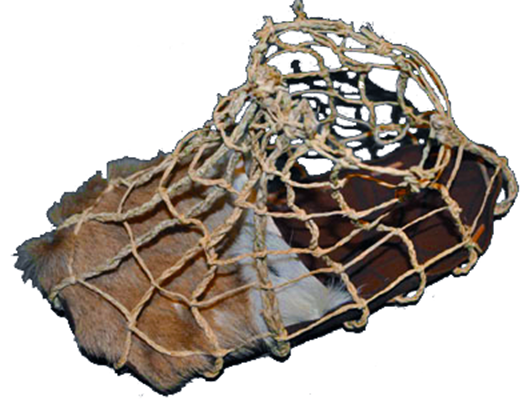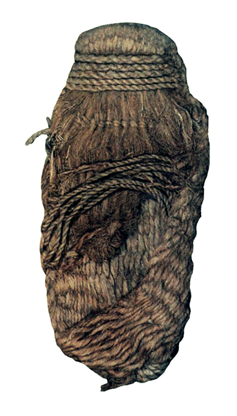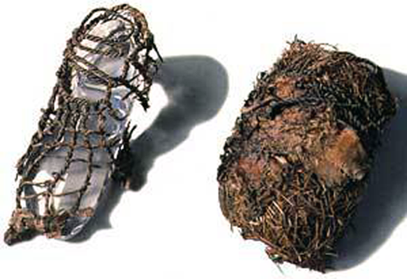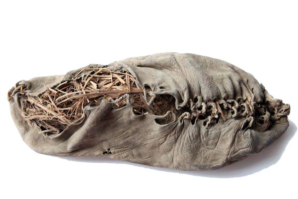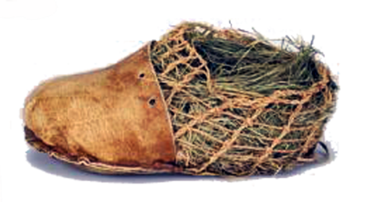 Sapato do OTZI (3300 A.C.) – Couro com amarras em fibra trançada e proteção de palha