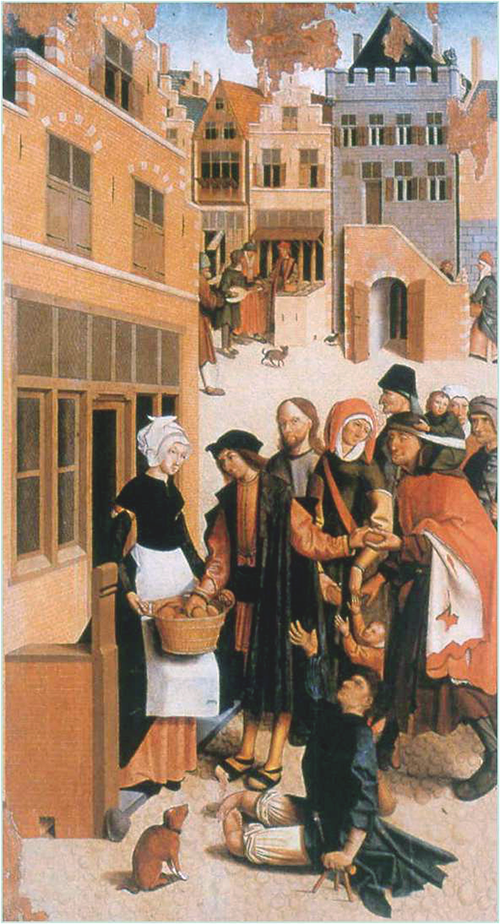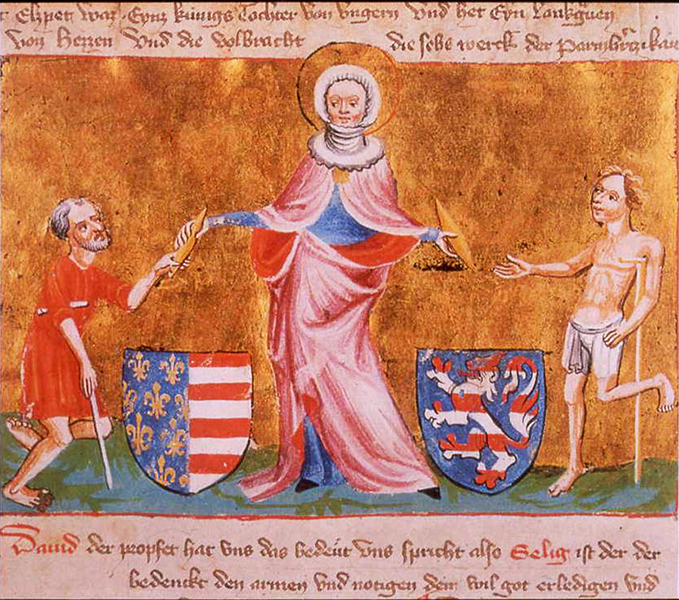 1. A imagem de 1420 demonstra Santa Elisabete da Hungria oferecendo o pão para dois enfermos com deformidades no pé e na perna usando bengalas. Esta imagem é de uma coleção de miniaturas de obras impressas no livro texto do Hospital Medieval Espirito Santo de Nuremberg, Alemanha (1420), servindo como princípio orientador do sistema hospitalar da época.