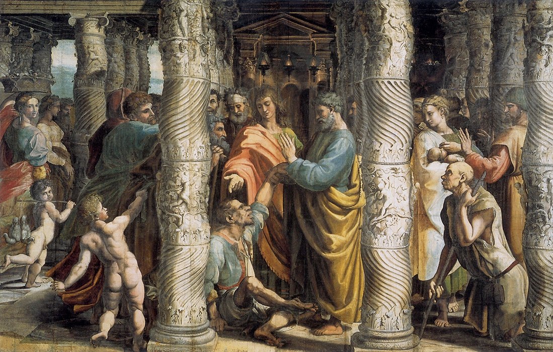 2. Raffaelo Sanzio (1483 - 1520) pintou vária obras sobre a vida e atos dos apóstolos de Cristo. Em 1515 fez um desenho retratando o primeiro milagre de Pedro após a crucificação de Cristo: ” The heal of Lame Man” – A cura do homem coxo (aleijado, manco).