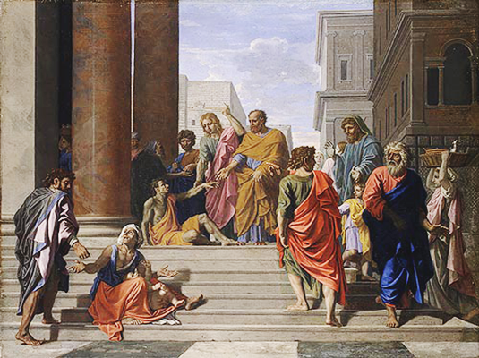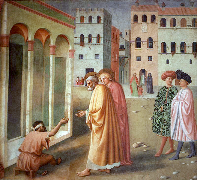 A figura relata o momento em que os Apóstolos Pedro e João encontram na porta do Templo de Jerusalém um homem coxo pedindo esmolas e lhe dão a cura de seu mal. Pedro, apontando para o céu, disse: “Não tenho ouro nem prata , mas o que eu tenho eu te dou. Em nome de Jesus, o Nazareno, levanta-te e anda! ” Pedro pegou-o pela mão e levantou-o, agora os pés e os tornozelos do homem estavam fortes, ele levantou-se e começou a andar ao redor, entrou no templo andando e louvando a Deus juntamente com Pedro e João.