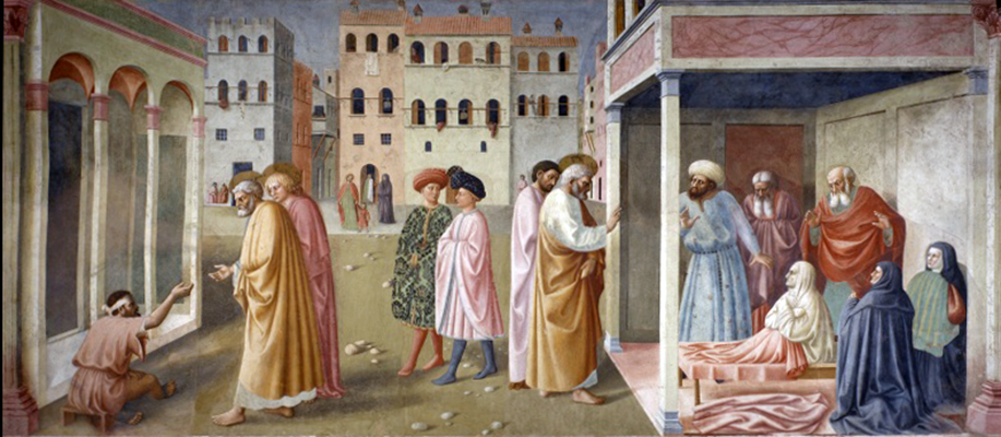 Na parede direita da capela aparece novamente a representação do milagre de Pedro, ” A Cura do Homem Coxo”, e no mesmo quadro, “A Ressureição de Tabita”, um dos milagres de ressuscitação realizado pelo apóstolo de Cristo.
