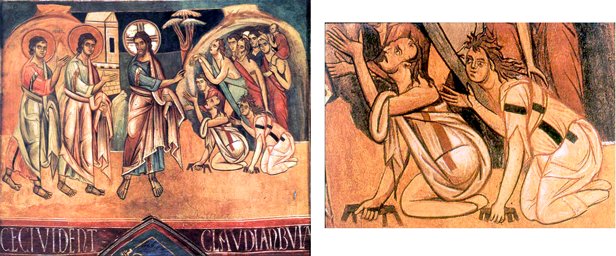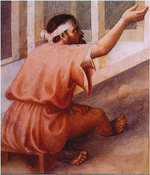 8. Entre os vários milagres de Cristo, em um deles houve a cura de dez leprosos na divisa entre Samária e Galiléia. Este afresco representa essa passagem. No detalhe vemos um homem com amputação da perna esquerda e outro sem os dois pés.