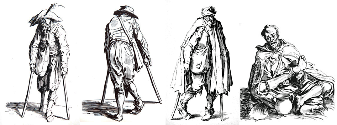 7. Jacques Callot (Nancy, Fr; 1592 - 1635) desenhista francês tinha um talento singular para imaginar posturas, fisionomias, trajes e figuras extravagantes. Sua cidade, Nancy, foi sitiada e humilhada com a entrada do exército de Luís XIII. Durante a guerra desenhou os suplícios e sofrimentos em uma série de dezoito imagens, além da outras inúmeras ilustrações impactantes e disformes.