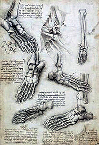 Leonardo desenhou muitos estudos sobre o esqueleto humano e suas partes, bem como o sistema nervoso, o coração, as artérias, as veias, os órgãos sexuais e outros órgãos internos. Ele fez um dos primeiros desenhos científicos de um feto no útero. Leonardo observou e registrou cuidadosamente os efeitos anatômicos e fisiológicos da idade e da emoção sobre o corpo humano, estudando em particular os efeitos da raiva. Ele também desenhou muitas figuras importantes que tinham deformidades faciais e sinais de doenças.