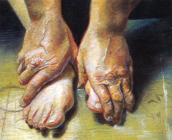 Tela intitulada ”Alimentando os Famintos”, retrata uma senhora distribuindo pães para os mendigos. Entre eles um homem com deformidade em ambos os pé e pernas, utilizando uma espécie de apoio em tripé nas mãos para se locomover.