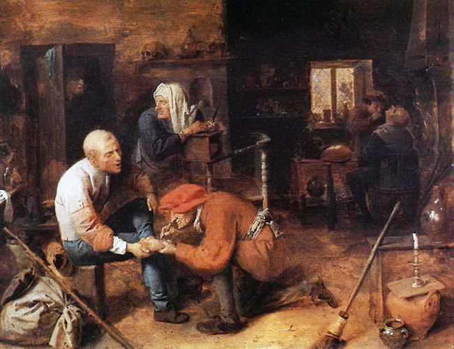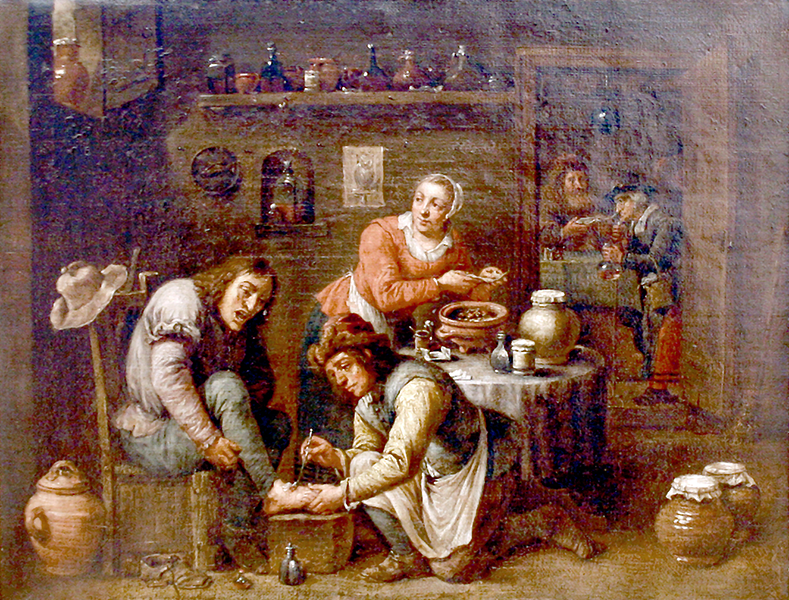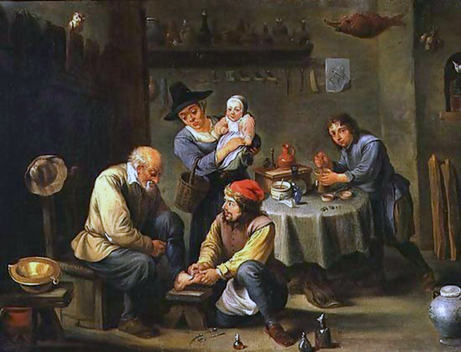 Outros pintores que seguiram a escola de Teniers e inspiraram-se na tela ” Operação do pé ” reproduziram esta cena em suas obras: